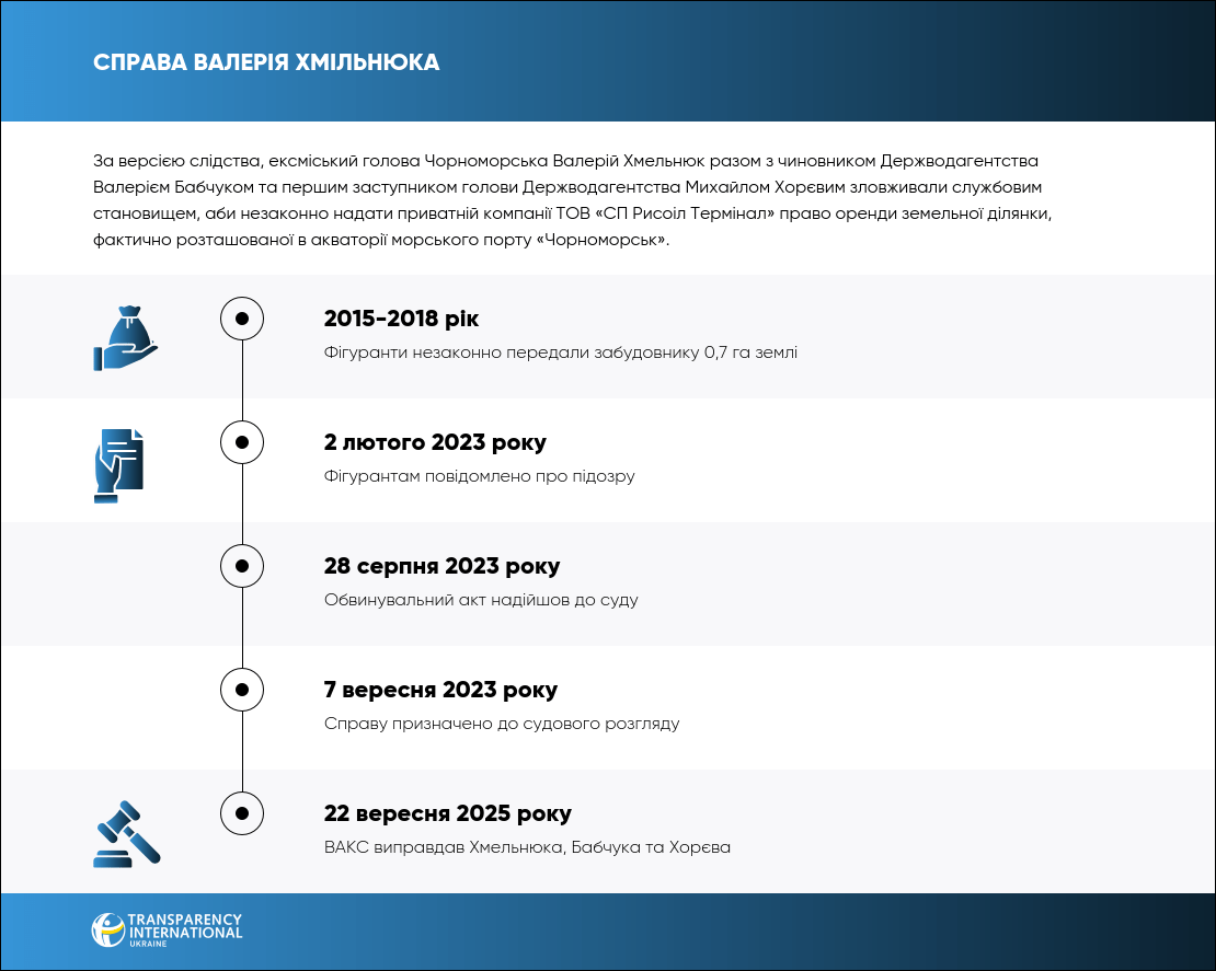 ВАКС визнав невинуватим ексмера Чорноморська Валерія Хмельнюка, чиновника Держводагентства Валерія Бабчука та першого заступника голови Держводагентства Михайла Хорєва у махінаціях із землею в акваторії порту Чорноморська.