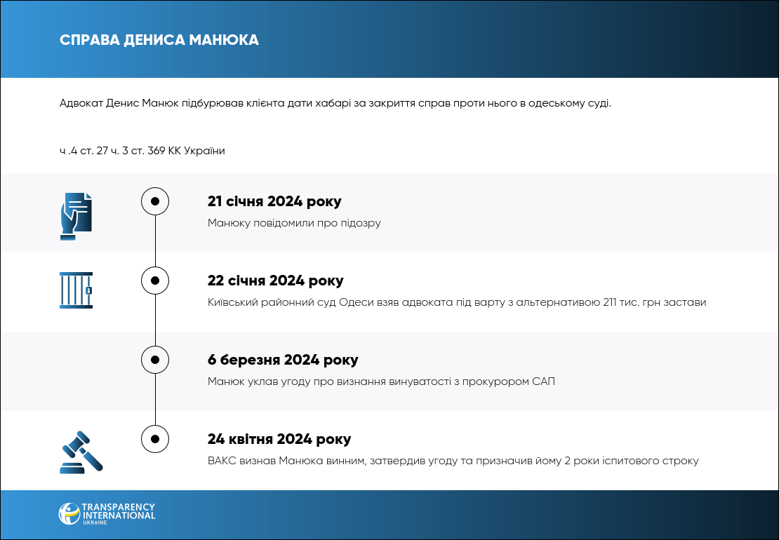 24 квітня 2024 року ВАКС визнав винним адвоката та експомічника судді Дениса Манюка у підбурюванні свого клієнта до надання хабаря судді за закриття справ проти нього. Суд визначив Манюку 2 роки іспитового строку, звільнивши від 4 років позбавлення волі.