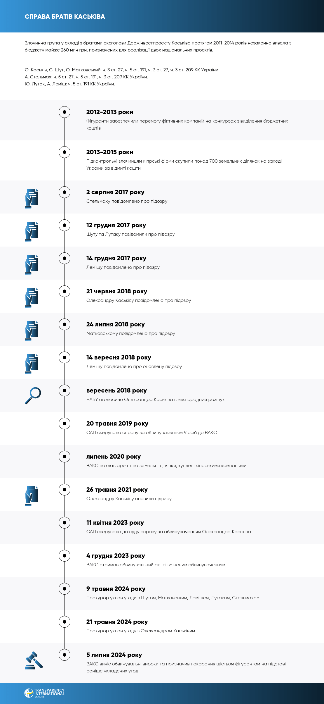 5 липня 2024 року ВАКС визнав братів ексголови Держінвестпроєкту Владислава Каськіва та ще низку осіб винними у заволодінні 260 млн грн, виділеними для реалізації двох національних проєктів у 2012 році. Усі фігуранти визнали свою вину.