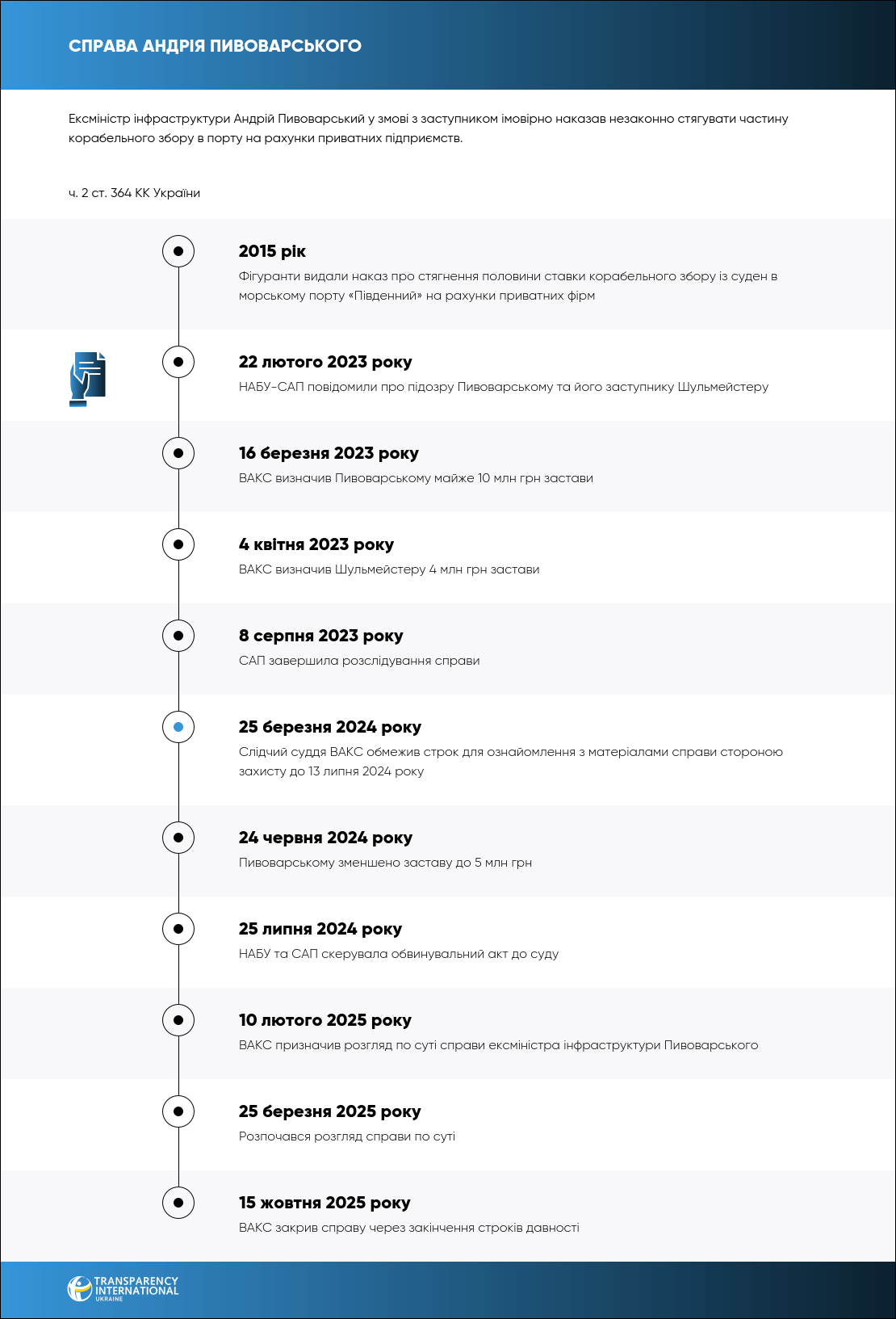 Слідство стверджує, що у 2015 році Пивоварський і його ексзаступник Володимир Шульмейстер видали наказ, який дозволяв приватним компаніям стягувати половину ставки корабельного збору із суден в морському порту «Південний». Наказ видали попри те, що акваторія порту є державною власністю і право на збори належить виключно держпідприємству. Попередньо на засіданні Тарифної ради було визначено, що корабельний збір повинен справлятися виключно на користь ДП «АМПУ». Проте один із високопосадовців Мінінфраструктури дав доручення своєму підлеглому, заступнику директора Департаменту економіки та фінансів продовжити роботу над розподілом збору між державним підприємством та приватними компаніями ТОВ «ТІС — Контейнерний термінал» і ТОВ «ТІС — Руда».