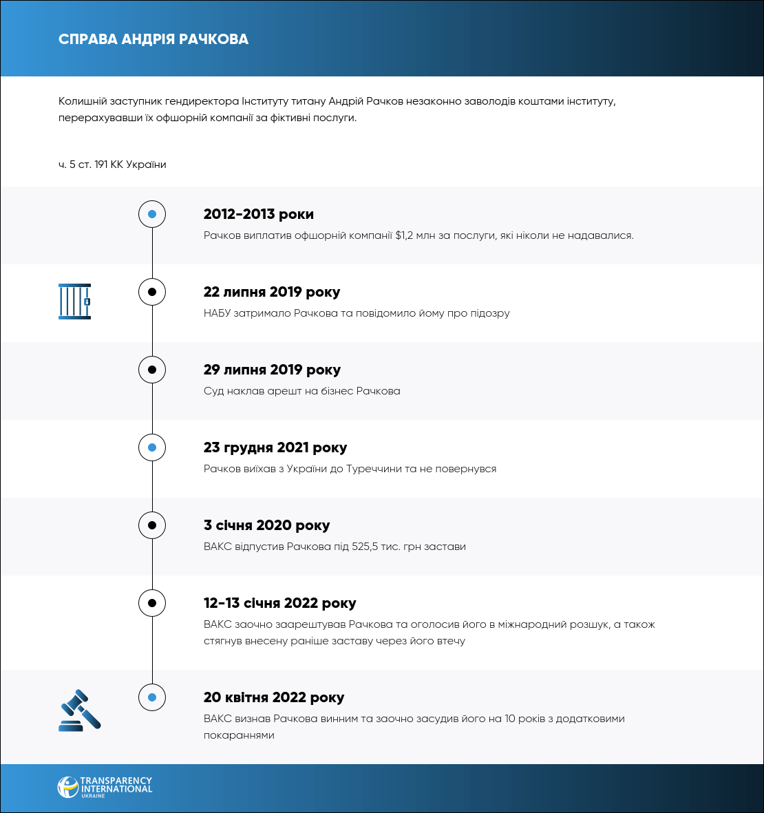Дії Рачкова суд кваліфікував за ч. 5 ст. 191 КК України та заочно призначив йому покарання у вигляді 10 років позбавлення волі з конфіскацією всього майна та заборона обіймати певні посади на 3 роки. Також суд задовольнив цивільний позов і поставив стягнути з обвинуваченого Рачкова 10 млн грн на користь Інститут титану.