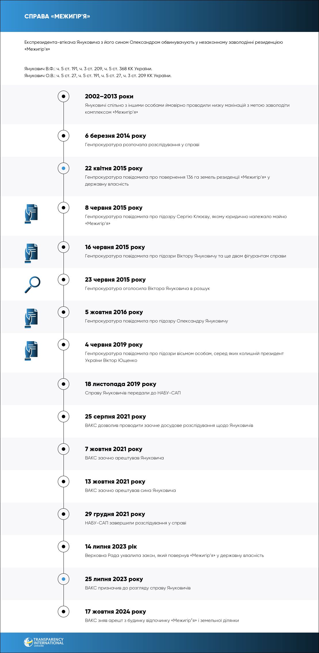 Експрезидента-втікача Віктора Януковича та його сина Олександра обвинувачують у незаконному заволодінні резиденцією «Межигір'я». Суму матеріальної шкоди оцінюють у понад 540 млн грн.