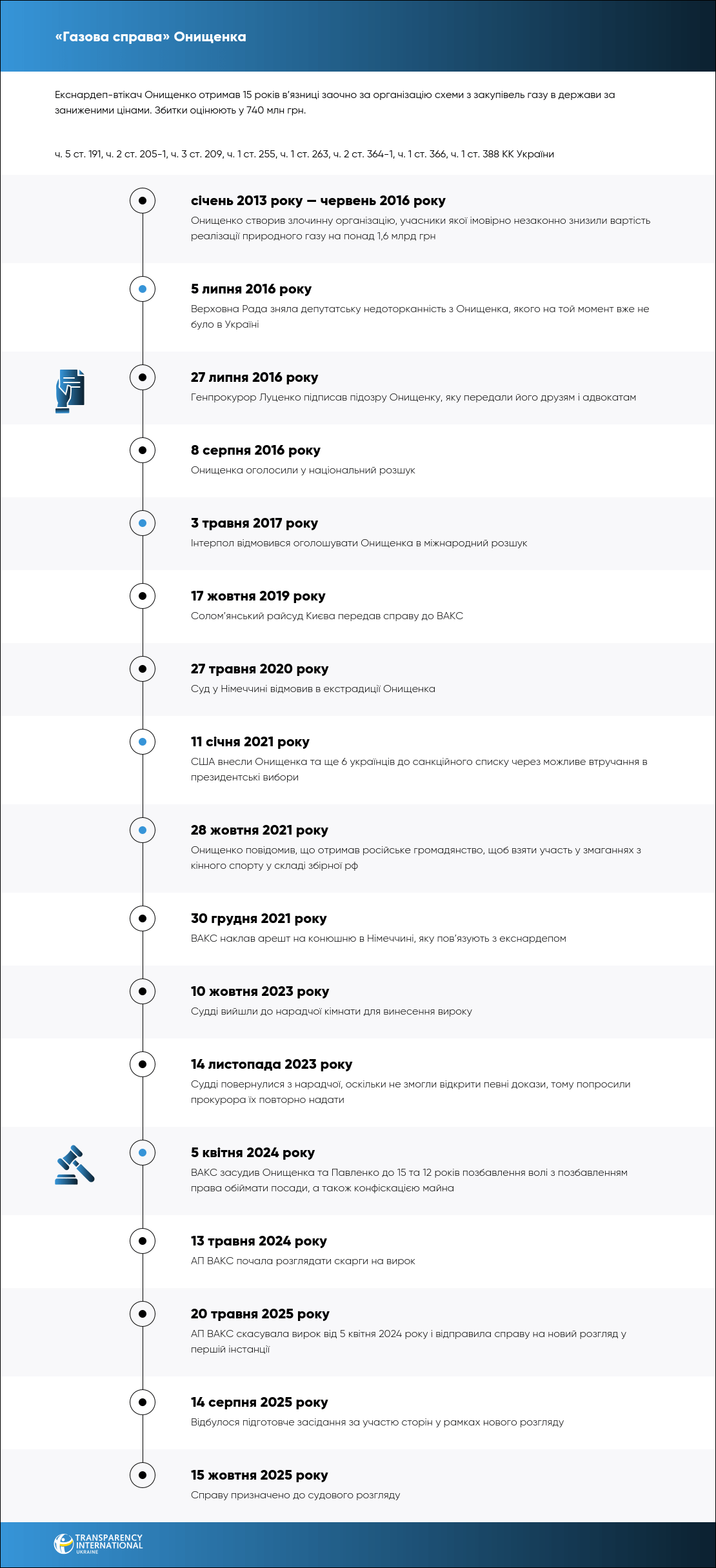 5 квітня 2024 року ВАКС засудив екснардепа Олександра Онищенка до 15 років позбавлення волі. Вирок Онищенку проголосили заочно, оскільки він переховується за кордоном. Однак 20 травня 2025 року Апеляційна палата ВАКС скасувала цей вирок та направила справу на новий розгляд до суду першої інстанції. Екснардепа обвинувачують в організації схеми заволодіння 740 млн грн на закупівлі газу за заниженими цінами.