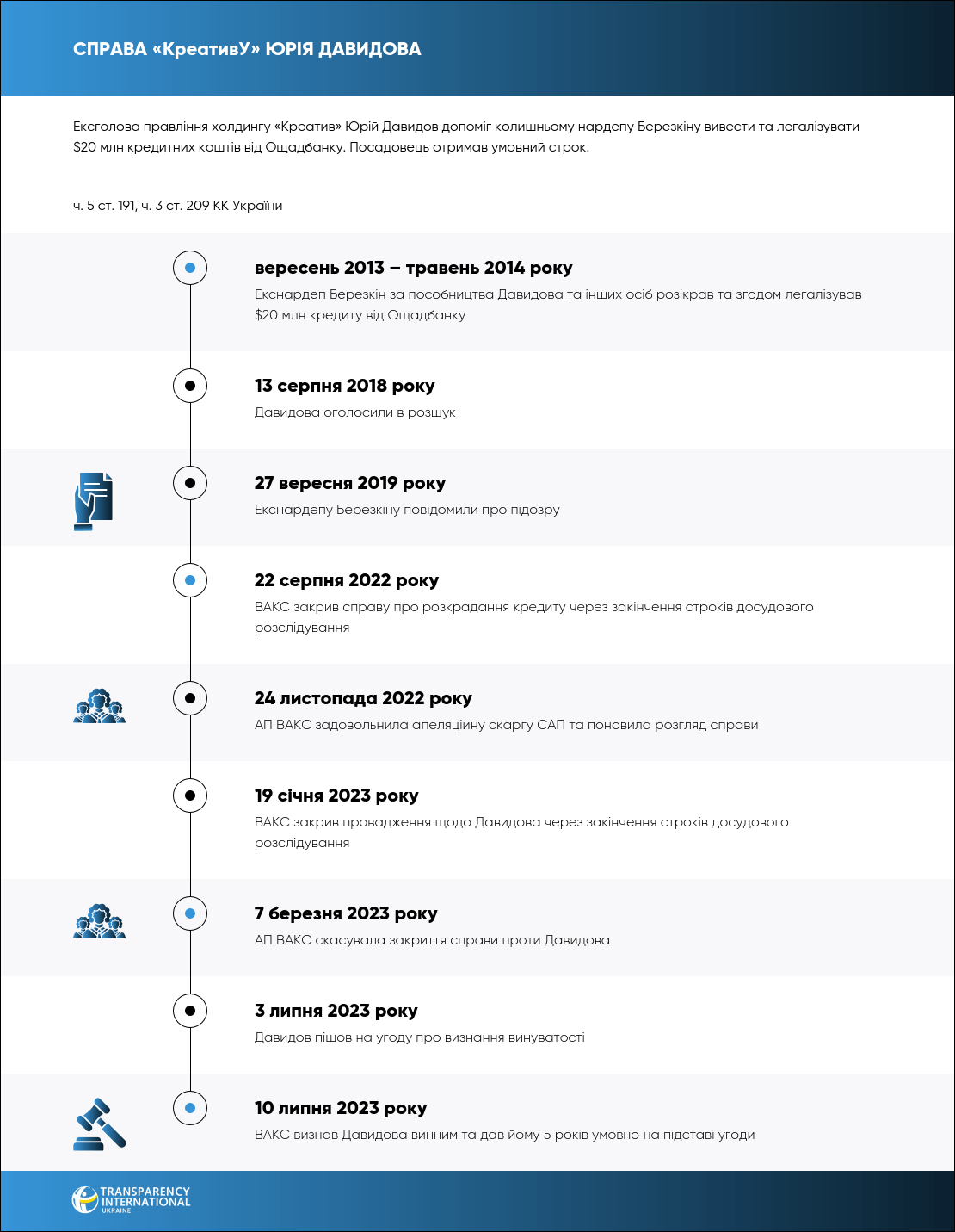 Давидову інкримінували ч. 5 ст. 27, ч. 5 ст. 191, ч. 3 ст. 209 КК України. Враховуючи укладену угоду про визнання винуватості, ВАКС призначив співучаснику 5 років умовно з іспитом строком на 3 роки, додатково заборонивши Давидову обіймати певні посади на 3 роки.