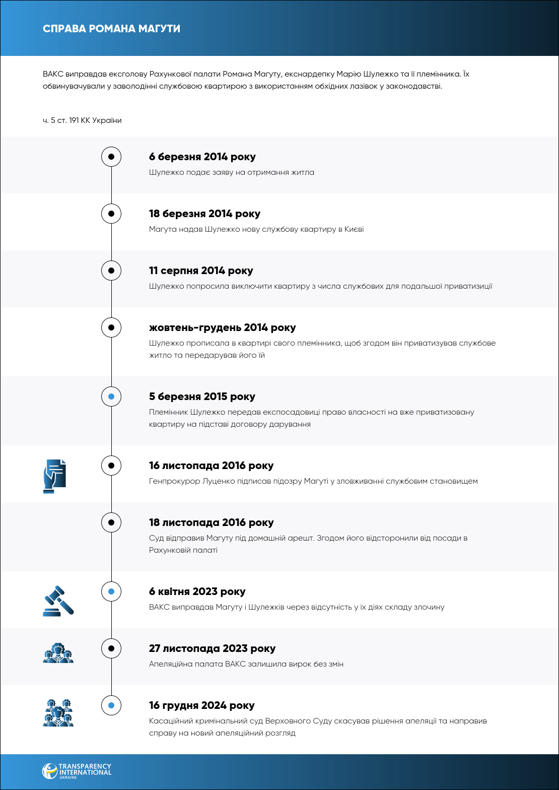 Дії Магути, Шулежко та її племінника кваліфікували за ч. 5 ст. 191 КК України, однак ВАКС не знайшов у їх діях складу злочину. Тому всі були виправдані.