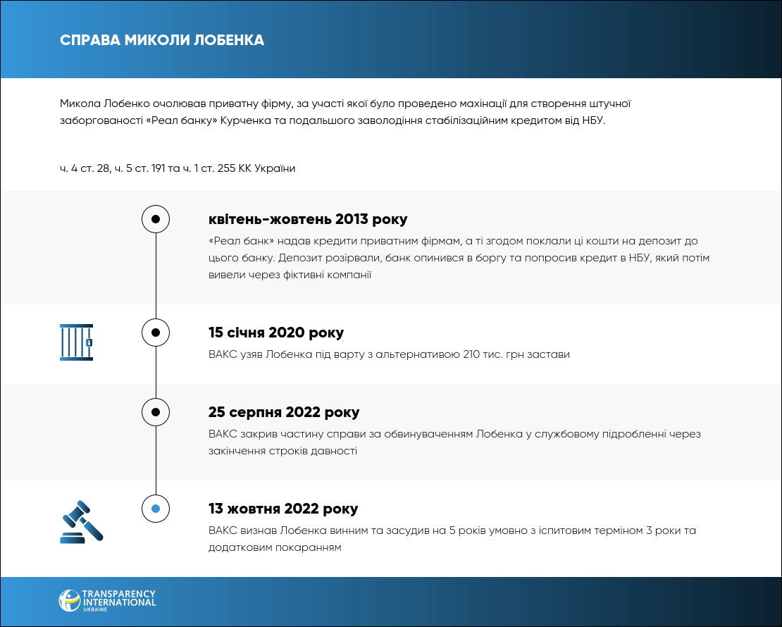 13 жовтня 2022 року ВАКС визнав винним керівника приватної фірми Миколу Лобенка у заволодінні 787 млн грн кредиту НБУ та участі в злочинній організації Януковича й Курченка.