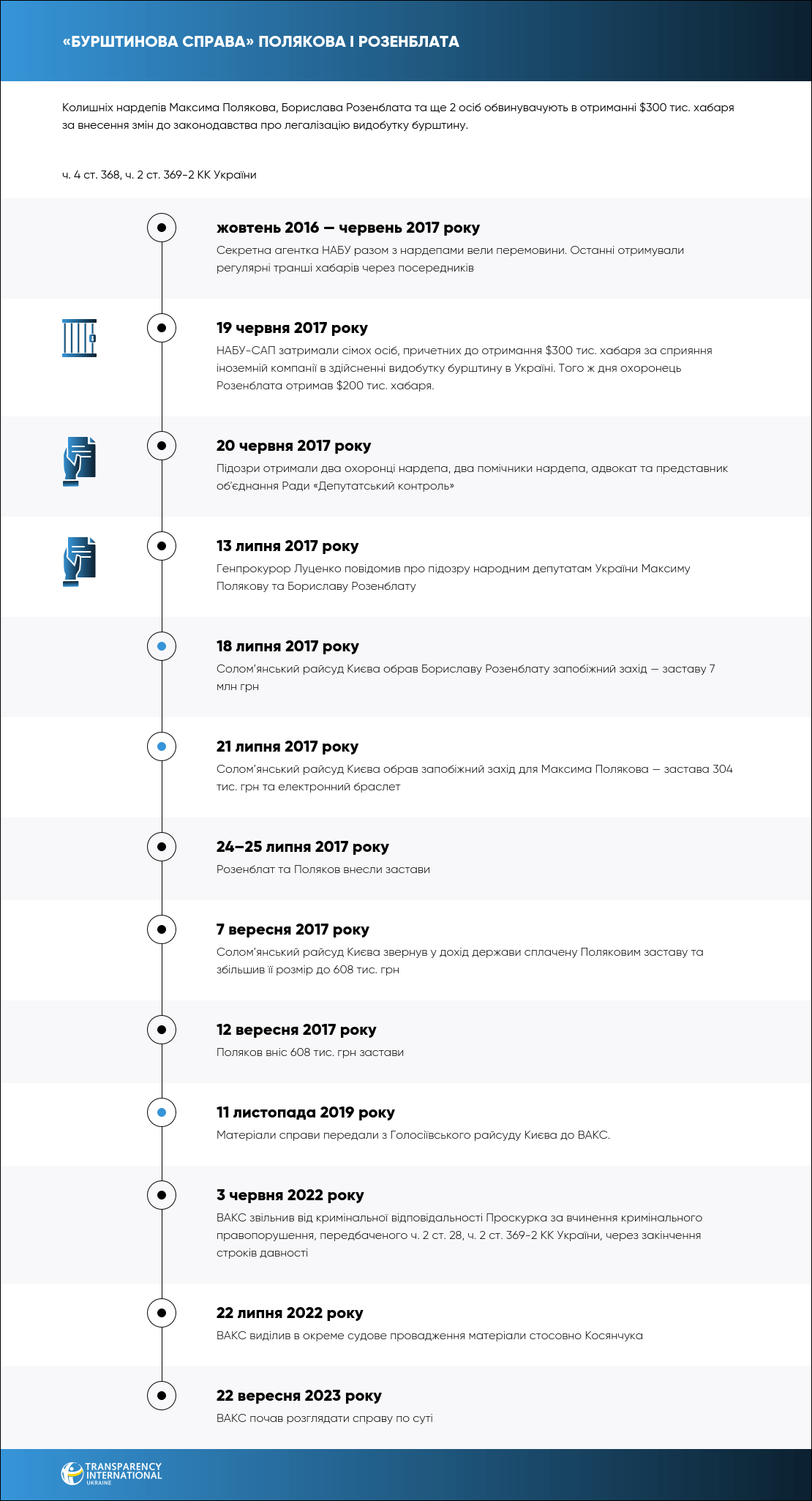 Полякову інкримінують ч. 4 ст. 368 КК України, Розенблату – ч. 4 ст. 368, ч. 2 ст. 369-2 КК України, помічниці Полякова Тетяні Любонько (Михайленко) – ч. 5 ст. 27, ч. 4 ст. 368 КК, а Косянчукові, Руденко та Проскурко — ч. 2 ст. 369-2 КК України.