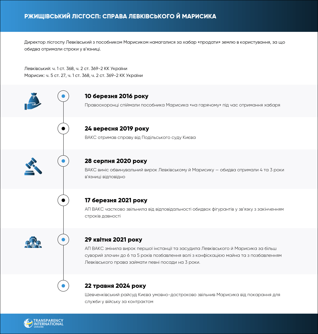 28 серпня 2020 року ВАКС визнав винним в.о. директора Ржищівського лісгоспу Олександра Левківського та його пособника Юрія Марисика в одержанні $10 тис. хабаря за вплив на начальника Київського управління лісгоспу у наданні землі в користування. Після остаточного розгляду справи в апеляційній інстанції їх засудили на 6 та 5 років за ґратами відповідно, з конфіскацією майна.