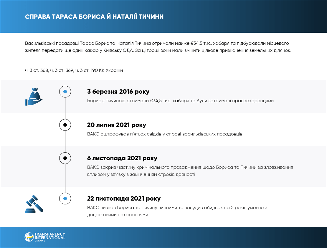 22 листопада 2021 року ВАКС визнав винними васильківських чиновників Тараса Бориса і Наталію Тичину в тому, що вони за хабар у $47 тис. пообіцяли змінити цільове призначення земельних ділянок. Обидвоє отримали 5 років умовно з додатковим покаранням.