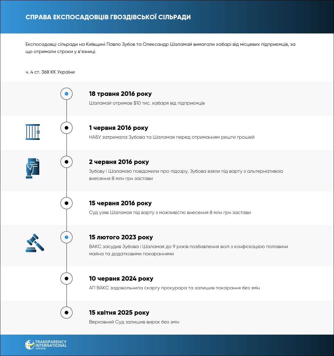 15 лютого 2023 року ВАКС визнав винними колишнього голову сільради на Київщині Павла Зубова та ексдепутата цієї ж сільради Олександра Шаламая у вимаганні €300 тис. та отриманні $10 тис. хабаря від місцевих підприємців.