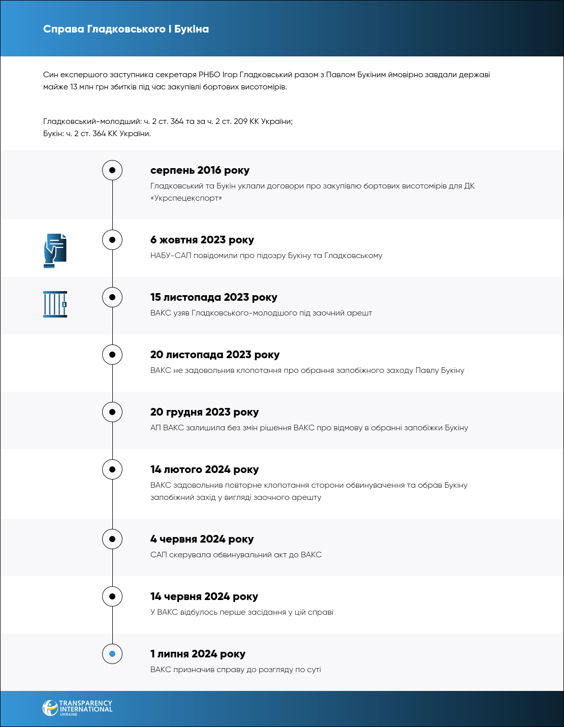 Його дії кваліфікували за ч. 2 ст. 364 та за ч. 2 ст. 209 КК України. Натомість Букіну інкримінували лише ч. 2 ст. 364 КК України.