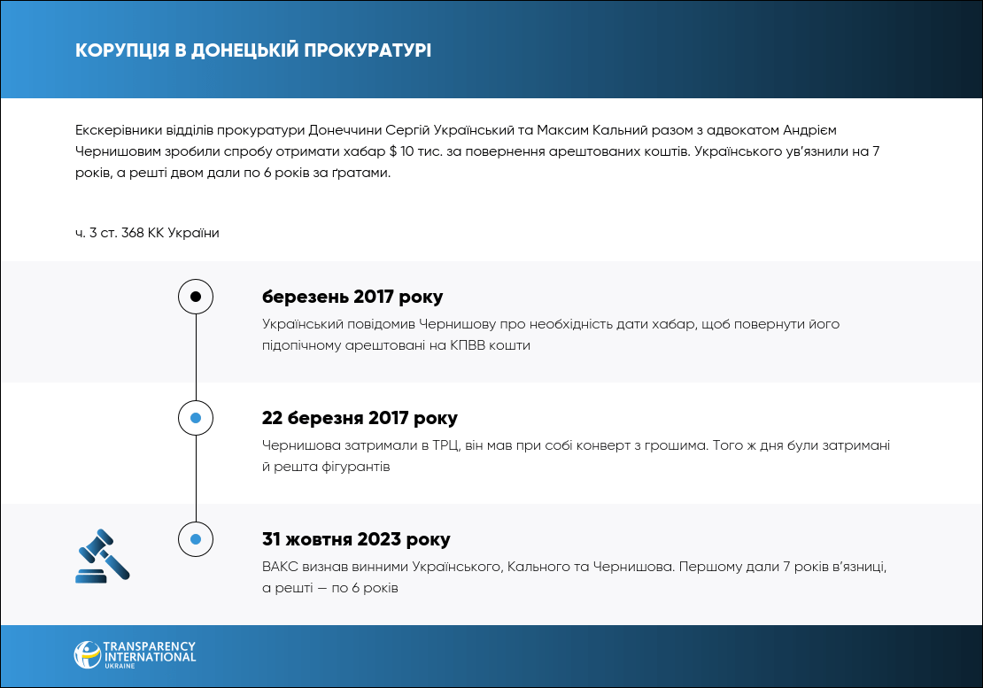 31 жовтня 2023 року ВАКС визнав винним двох ексначальників відділі прокуратури Донецької області Сергія Українського й Максима Кального та адвоката Андрія Чернишова в організації отримання $10 тис. хабаря.