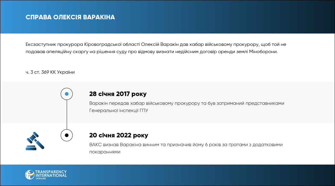 20 січня 2022 року ВАКС визнав винним ексзаступника прокурора Кіровоградської області Олексія Варакіна у тому, що він пропонував хабар військовому прокурору за неподання апеляційної скарги. Його ув’язнили на 6 років.