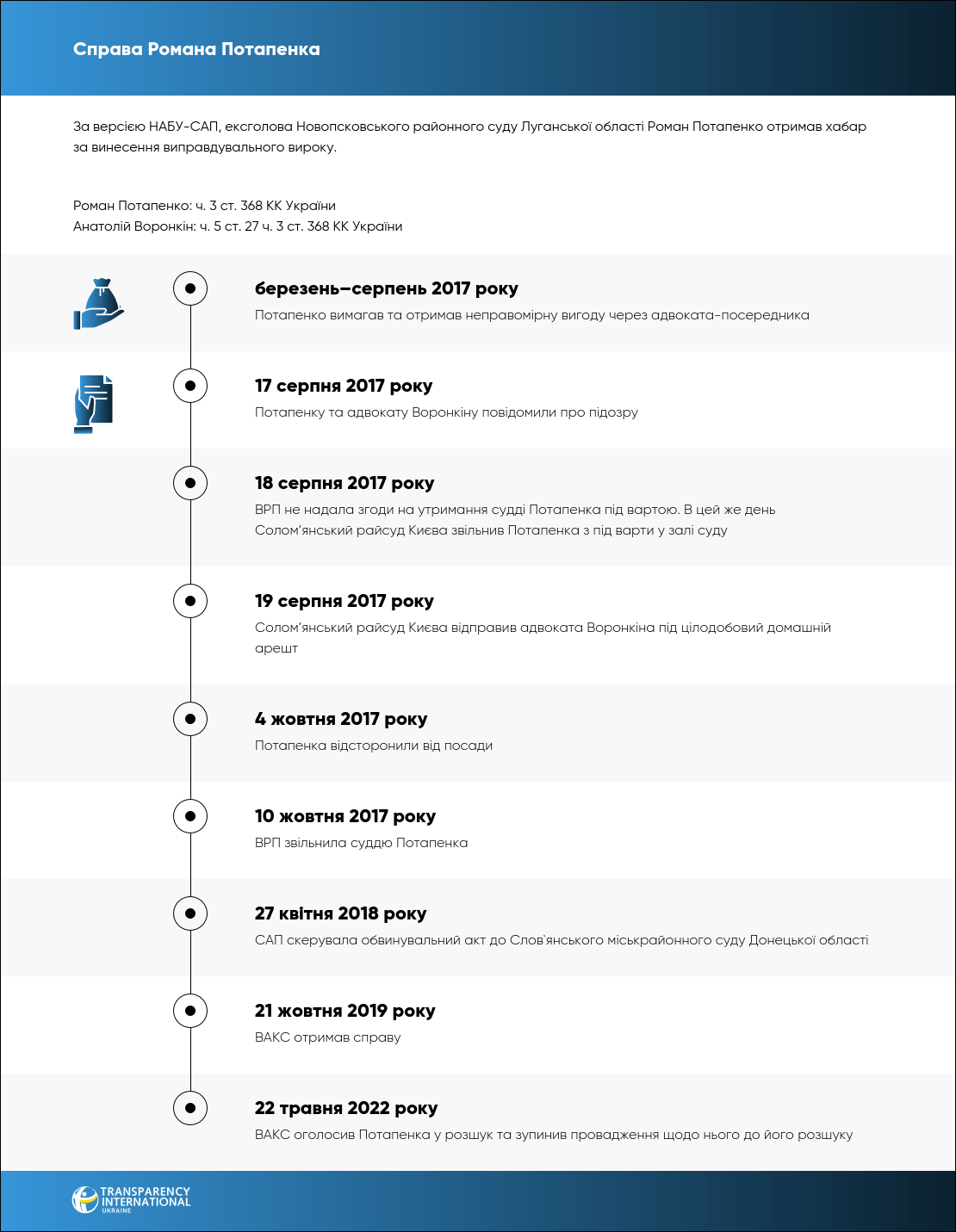 За версією сторони обвинувачення, Потапенко за посередництва адвоката Анатолія Воронкіна отримав $5,5 тис. хабаря від фігурантки справи за те, що суд не візьме її під варту. Фігурантку намагались засудити за шахрайство. Крім цього, за такий хабар суддя зобов’язався винести виправдувальний вирок.