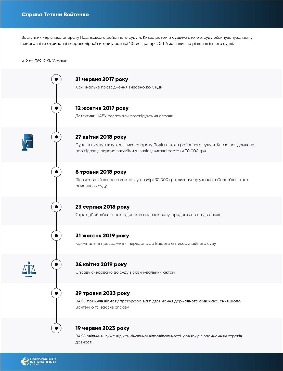 У 2023 році ВАКС закрив провадження щодо Чубко, оскільки сплив строк давності. Водночас Войтенко просила не закривати провадження щодо неї, однак прокурор відмовився від обвинувачення щодо неї через брак доказів.