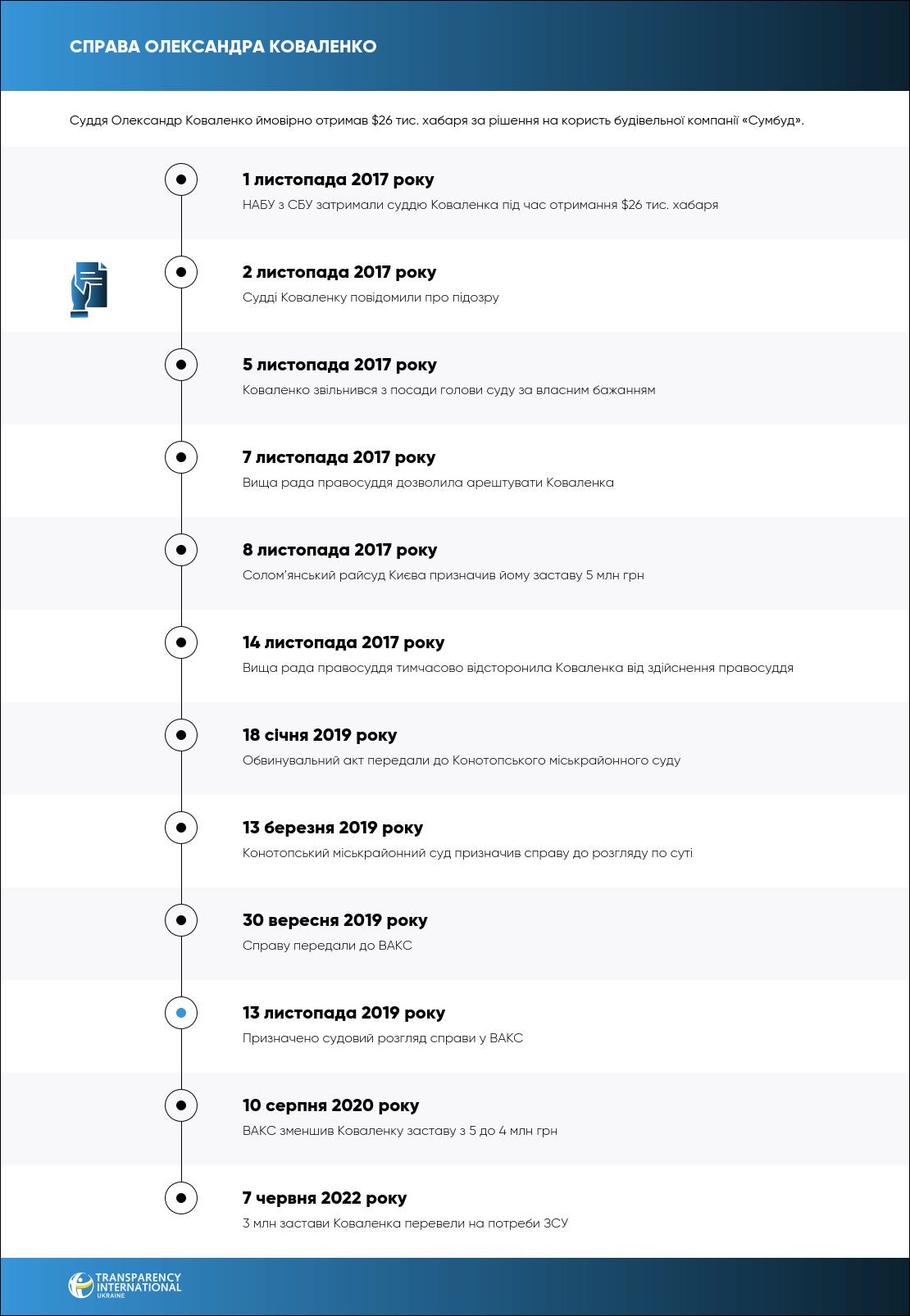 Суддю з Сумщини Олександра Коваленка обвинувачують в отриманні $26 тис. хабаря за рішення на користь будівельної компанії. Йому загрожує до 12 років позбавлення волі з конфіскацією майна.