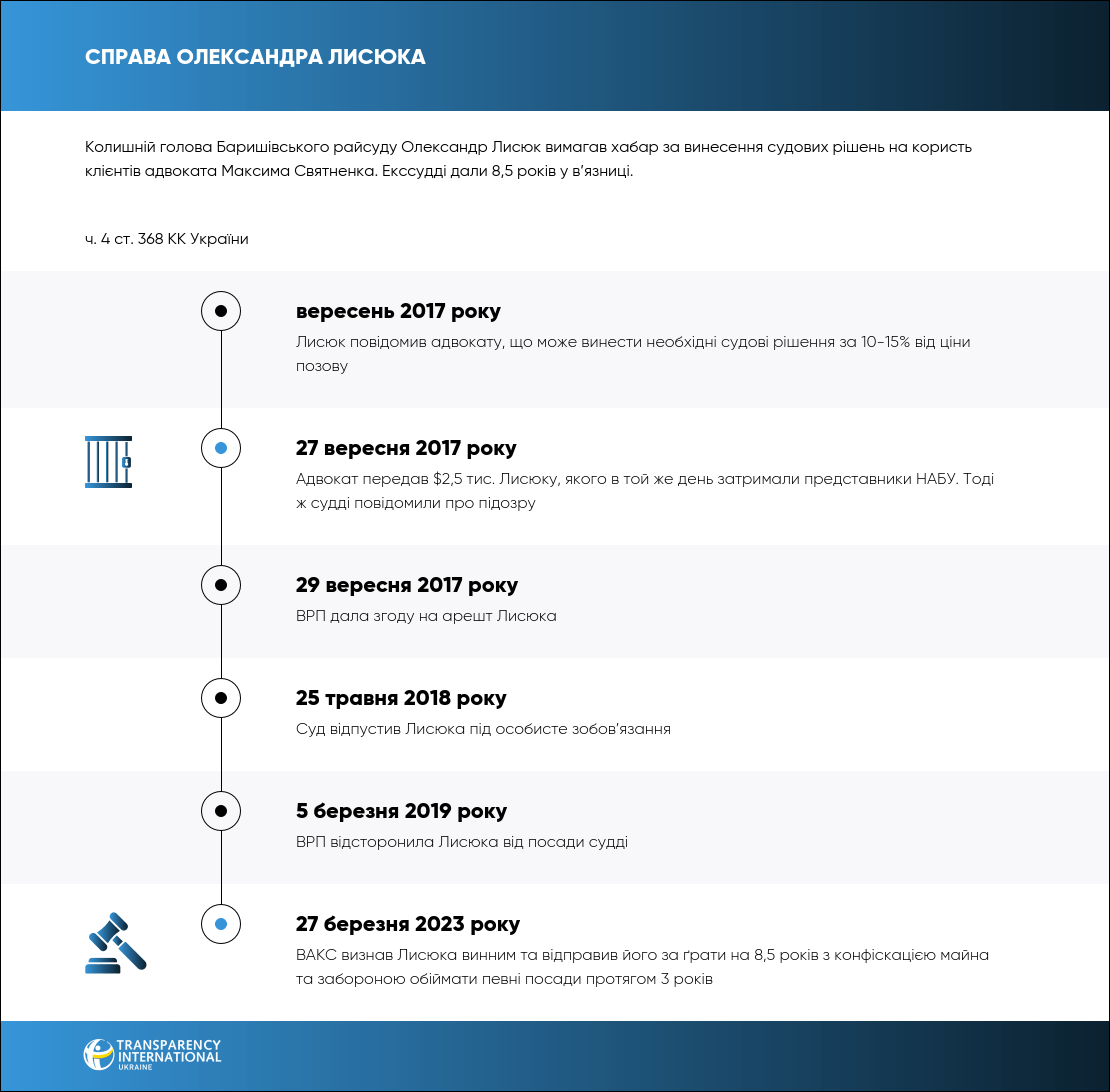 27 березня 2023 року ВАКС визнав винним колишнього голову Баришівського райсуду Олександра Лисюка у вимаганні хабаря за винесення рішень на користь клієнтів знайомого адвоката.