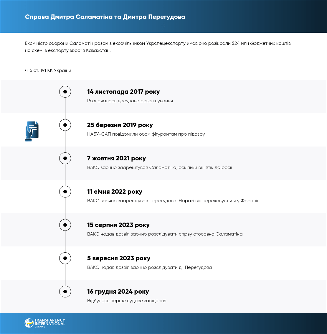 Обвинуваченим інкримінують ч. 5 ст. 191 КК України. У 2013 році Саламатін втік з України, у цьому ж році його звільнили з посади директора Укрспецекспорту. З 2017 року він переховується від слідства. Крім того, у 2020 році Генеральна прокуратура України оголосила йому підозру у державній зраді.