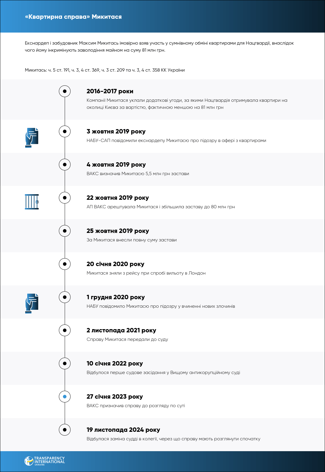 Микитасю інкримінують ч. 5 ст. 191, ч. 3, 4 ст. 369, ч. 3 ст. 209 та ч. 3, 4 ст. 358 КК України. Дії фігуранта Мармиша кваліфікували за ч. 5 ст. 191, ч. 3 ст. 209, ч. 3 ст. 28, ч. 3, 4 ст. 358 КК України. Юрію Аллерову інкримінують ч. 5 ст. 191, ч. 4 ст. 369 КК України. Віталій Лещенко фігурує у справі за ч. 5 ст. 191, ч. 4 ст. 368, ч. 5 ст. 27, ч. 2 ст. 28, ч. 4 ст. 358 КК України. Фігуранту Борисову інкримінують ч. 5 ст. 27, ч. 5 ст. 191, ч. 4 ст. 368 КК України.