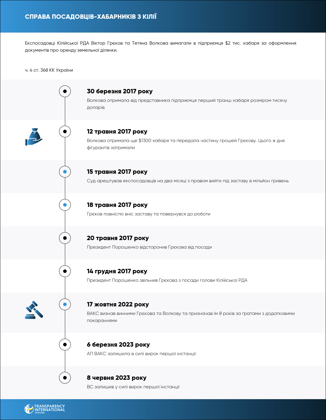 17 жовтня 2022 року ВАКС визнав винними експосадовців Кілійської РДА Одеської області Віктора Грєкова та Тетяну Волкову за отримання $2300 хабаря в розмірі за оформлення документів щодо оренди земельної ділянки.