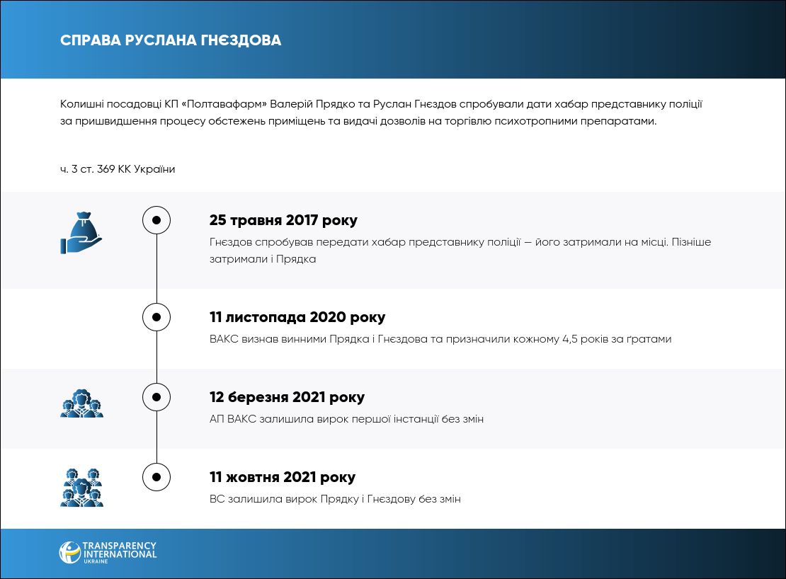 11 листопада 2020 року ВАКС визнав винними ексдиректора «Полтавафарм» та ексдепутата Полтавської облради Валерія Прядка та його ексзаступника Руслана Гнєздова за спробу дати хабар співробітнику поліції. Обидвох засудили на 4,5 роки.
