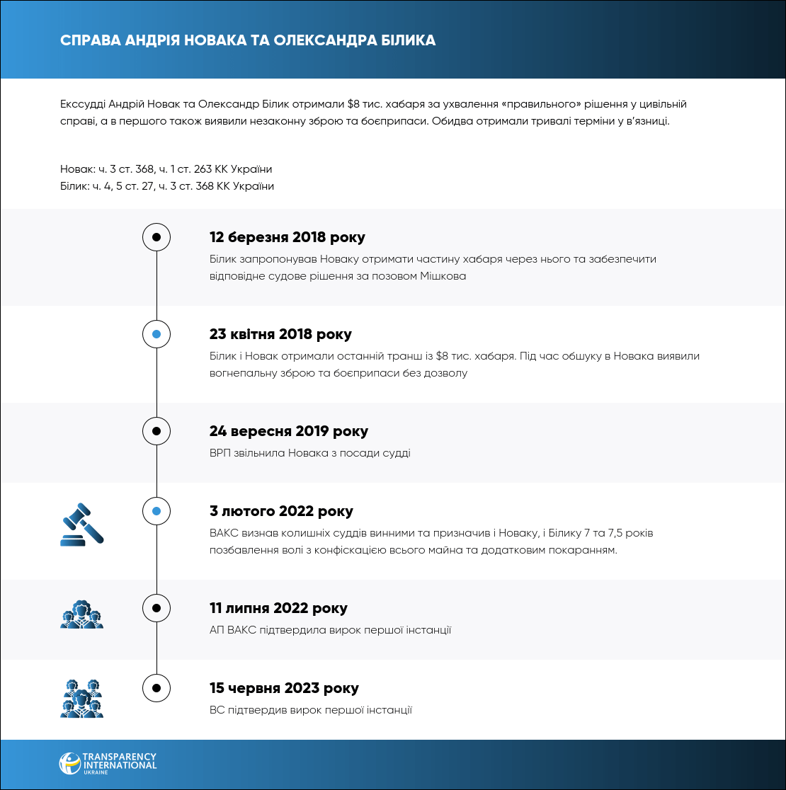 3 лютого 2022 року ВАКС визнав винними колишніх київських суддів Андрія Новака та Олександра Білика в тому, що вони отримали $8 тис. хабаря за ухвалення «правильного» рішення у цивільній справі. Обидвох позбавили волі — на 7,5 та 7 років відповідно.
