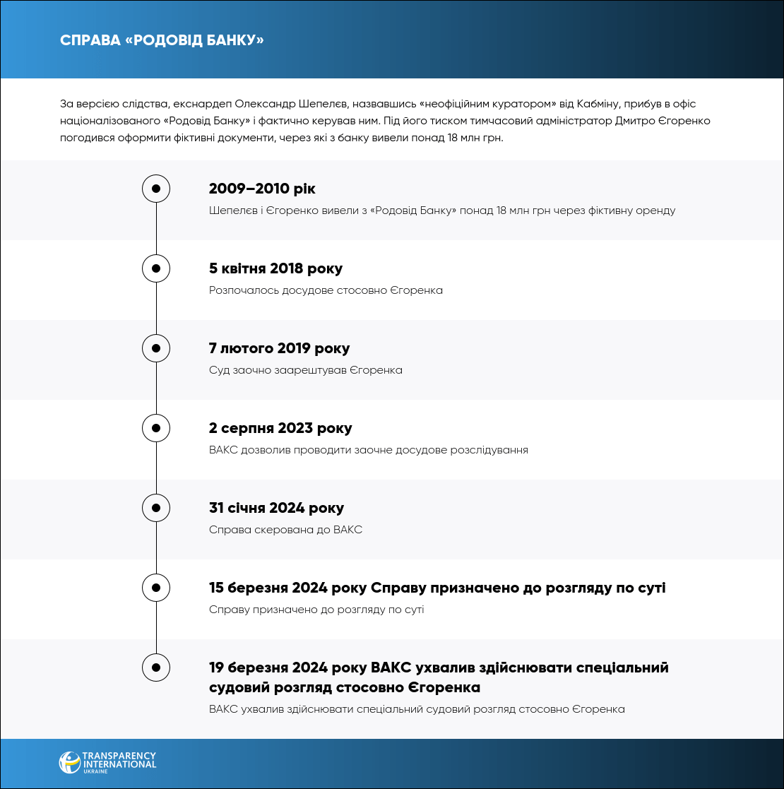 За версією слідства, коли «Родовід банк» потрапив у кризу, його включили до списку націоналізованих банків, а Нацбанк призначив тимчасову адміністрацію. Тимчасовим адміністратором став Дмитро Єгоренко. Уся документація, печатки та управління активами перейшли до нього і з цього моменту він мав повний контроль над фінансовими операціями банку.