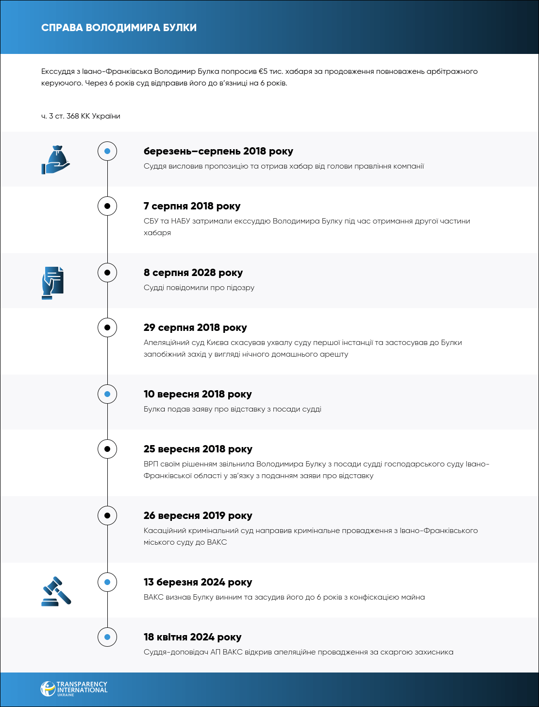 13 березня 2024 року ВАКС виніс вирок екссудді Івано-Франківського господарського суду Володимиру Булці за вимагання €5 тис. хабаря за продовження строку повноважень арбітражного керуючого ПАТ «Живиця» у справі про банкрутство.