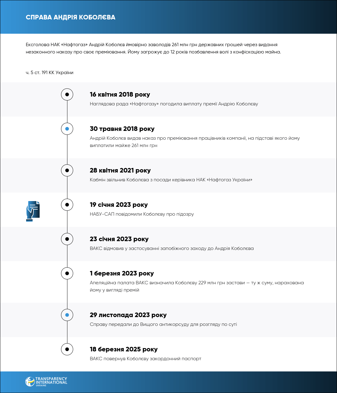 За версією слідства, Андрій Коболєв у 2018 році видав незаконний наказ про преміювання співробітників «за екстраординарні досягнення», на підставі якого сам отримав 261 млн грн.