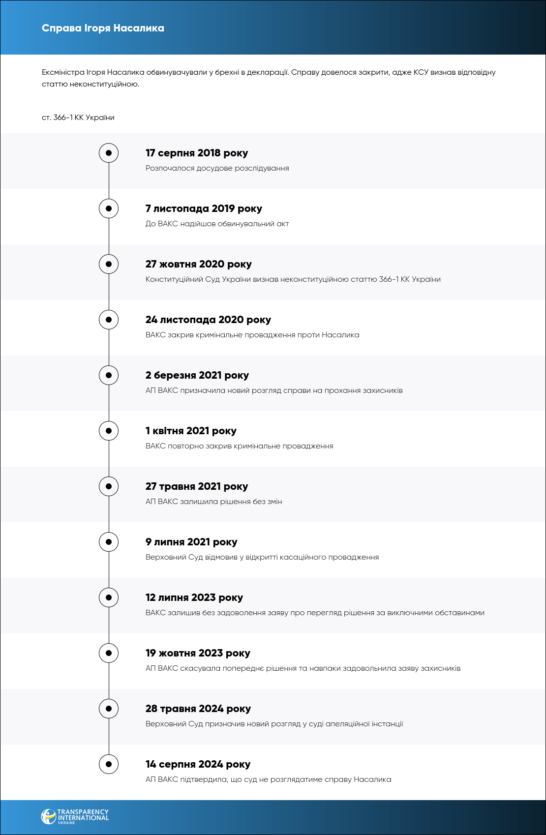 Ексміністру інкримінували ст. 366-1 КК України. Через скандальне рішення Конституційного суду, яке декриміналізувало недостовірне декларування, справу Насалика було закрито в листопаді 2020 року. Після цього розгляд поновлювали, а суд ще кілька разів закривав провадження. У березні 2023 року адвокат Насалика подав заяву про перегляд рішення за виключними обставинами. Захист вважав, що суд має винести виправдувальний вирок, адже у діях Насалика не було злочину. Врешті суд відмовився відновлювати розгляд справи.