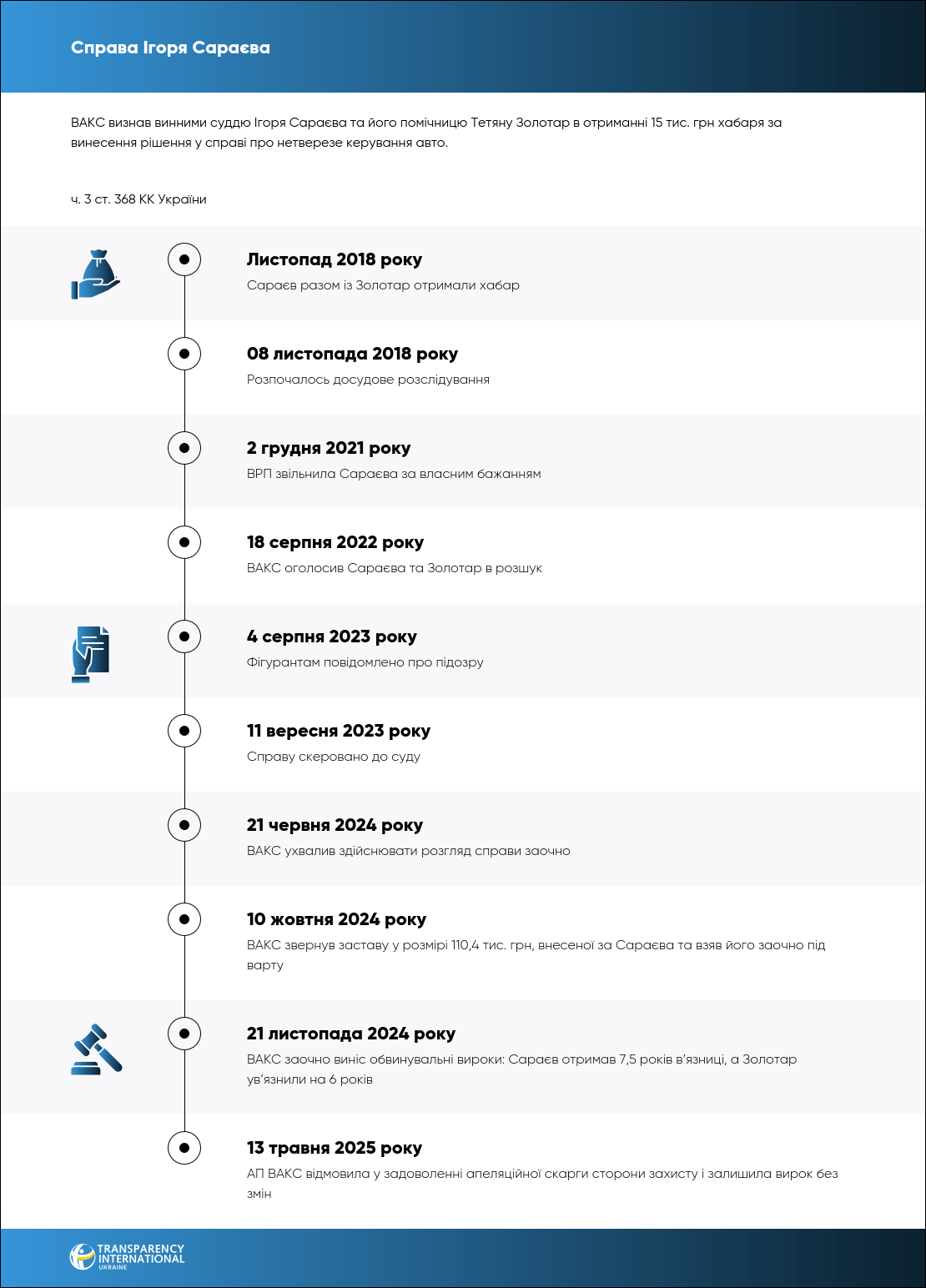 ВАКС визнав винними суддю Приморського райсуду Маріуполя Ігоря Сараєва та його помічницю Тетяну Золотар в отриманні 15 тис. грн хабаря. Справа була розглянута за процедурою спеціального судового провадження за відсутності обвинувачених (in absentia), тобто заочно. Згодом АП ВАКС підтримала вирок першої інстанції.