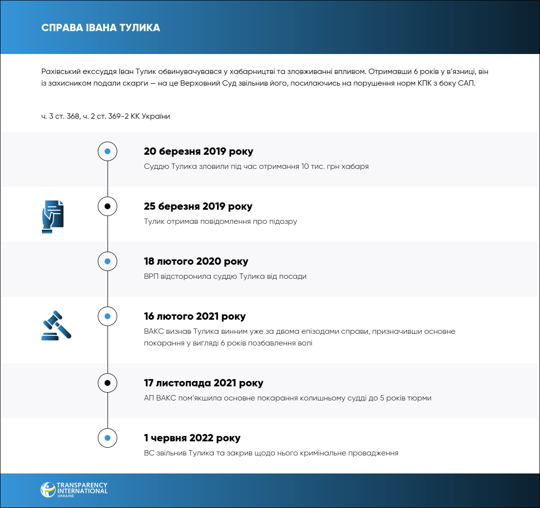 16 лютого 2021 року ВАКС визнав винним закарпатського екссуддю Івана Тулика у хабарництві та зловживанні своїм впливом на іншого суддю. За отримання відносно невеликого хабаря у 10 тис. грн Тулика спочатку засудили на 6 років за ґратами, але потім покарання взагалі скасували.