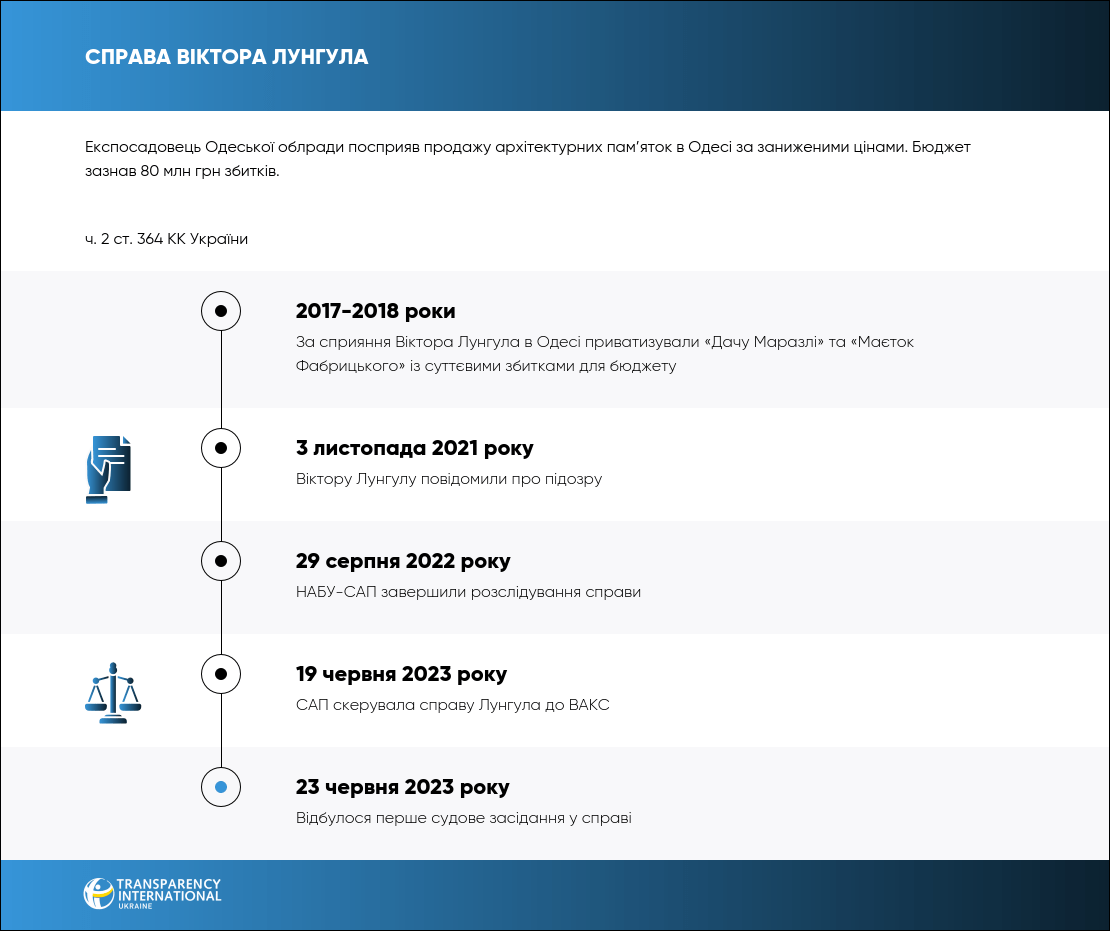 Віктор Лунгул імовірно організував продаж за заниженими цінами «Дачу Маразлі» і «Маєток Фабрицького», що в Одесі. У 2017 році ці об’єкти передали приватній фірмі «Крок вперед»в оренду терміном на 10 років. Наступного року, як вважає слідство, Лунгул посприяв тому, щоб ці об’єкти підлягали приватизації.