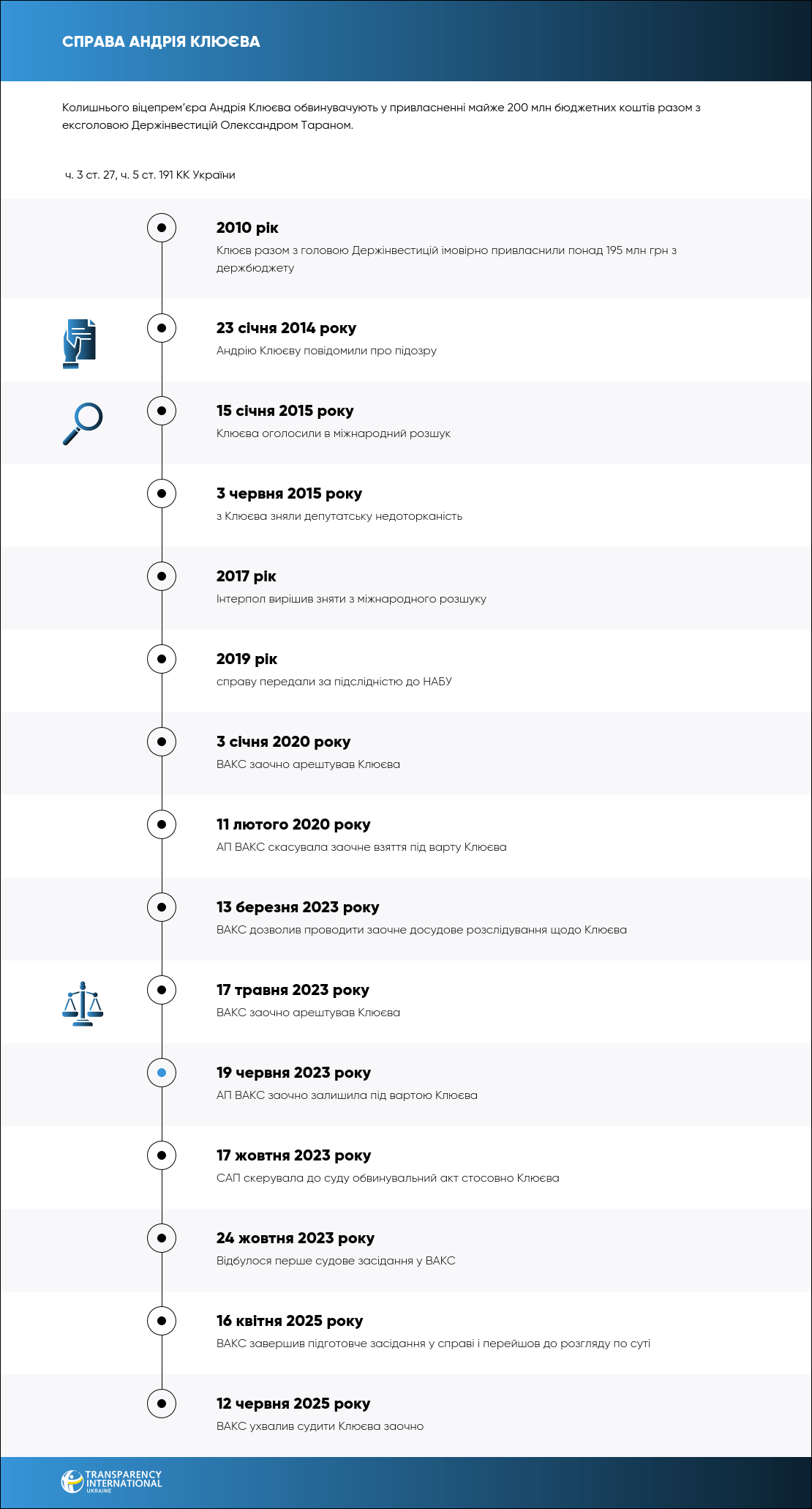 НАБУ-САП обвинувачують колишнього першого віцепрем’єра часів президента-втікача Андрія Клюєва у привласненні понад 195 млн грн бюджетних коштів разом з ексголовою Держінвестицій Олександром Тараном. Їм загрожує до 12 років позбавлення волі з конфіскацією майна.