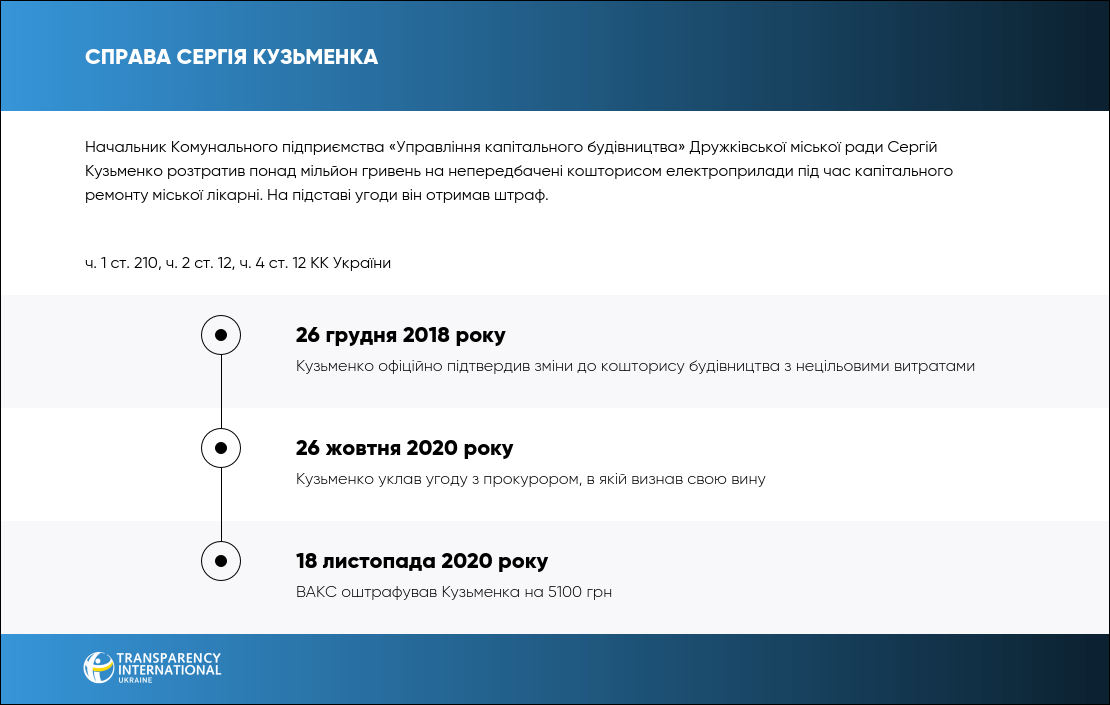 18 листопада 2020 року ВАКС визнав винним начальника дружківського КП «Управління капітального будівництва» Сергія Кузьменка в нецільовому використанні бюджетних коштів. За це він отримав 5 тис. грн штрафу