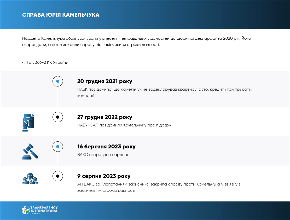 16 березня 2023 року ВАКС виправдав нардепа Юрія Камельчука, якого обвинувачували у недостовірному декларуванні.