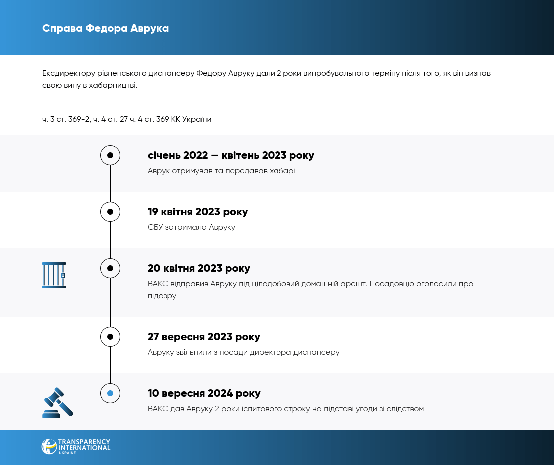 Злочин кваліфіковано за ч. 3 ст. 369-2, ч. 4 ст. 27 ч. 4 ст. 369 КК України. Аврука пішов на угоду про визнання винуватості, після чого отримав покарання — 2 роки іспитового строку.