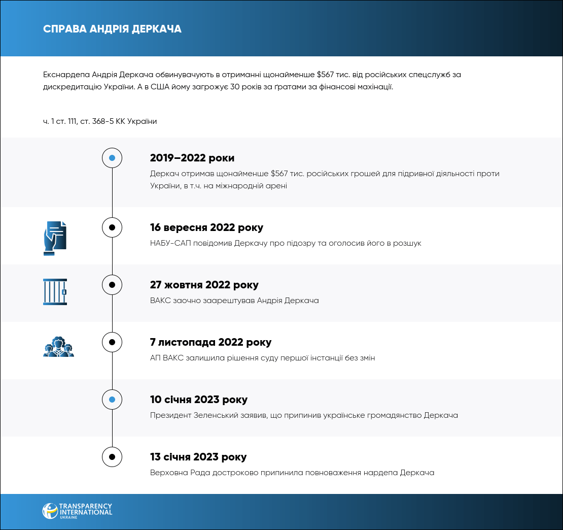 Андрію Деркачу інкримінують ч. 1 ст. 111 та ст. 368-5 КК України. Крім цього, СБУ в червні 2022 року викрила агентурну мережу російського генштабу, в якій брав участь Деркач. Як зазначили правоохоронці, екснардеп отримував від рф гроші для створення приватних охоронних компаній, які мали спростити окупацію українських міст.