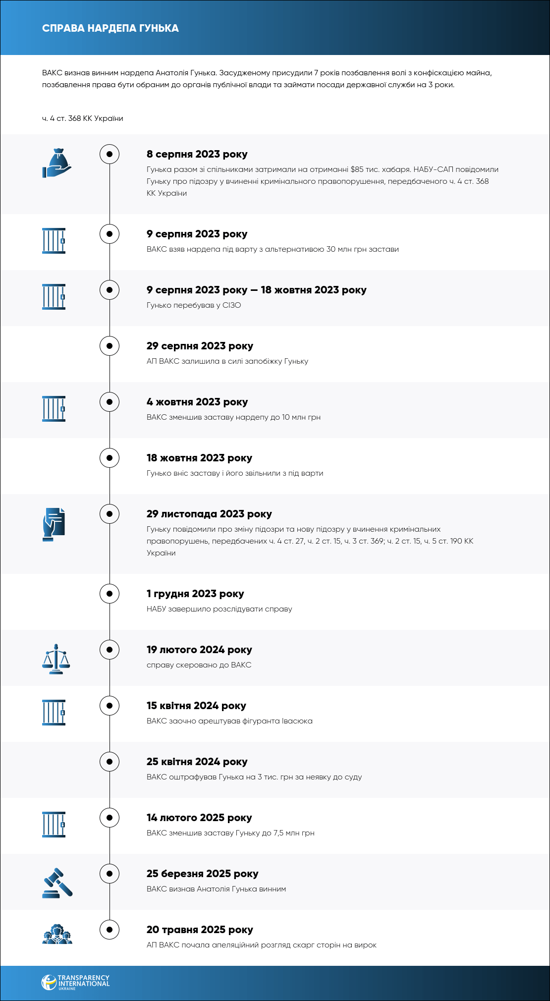 25 березня 2025 року ВАКС визнав винним нардепа Анатолія Гунька у спробах підбурити до надання хабаря та шахрайства.