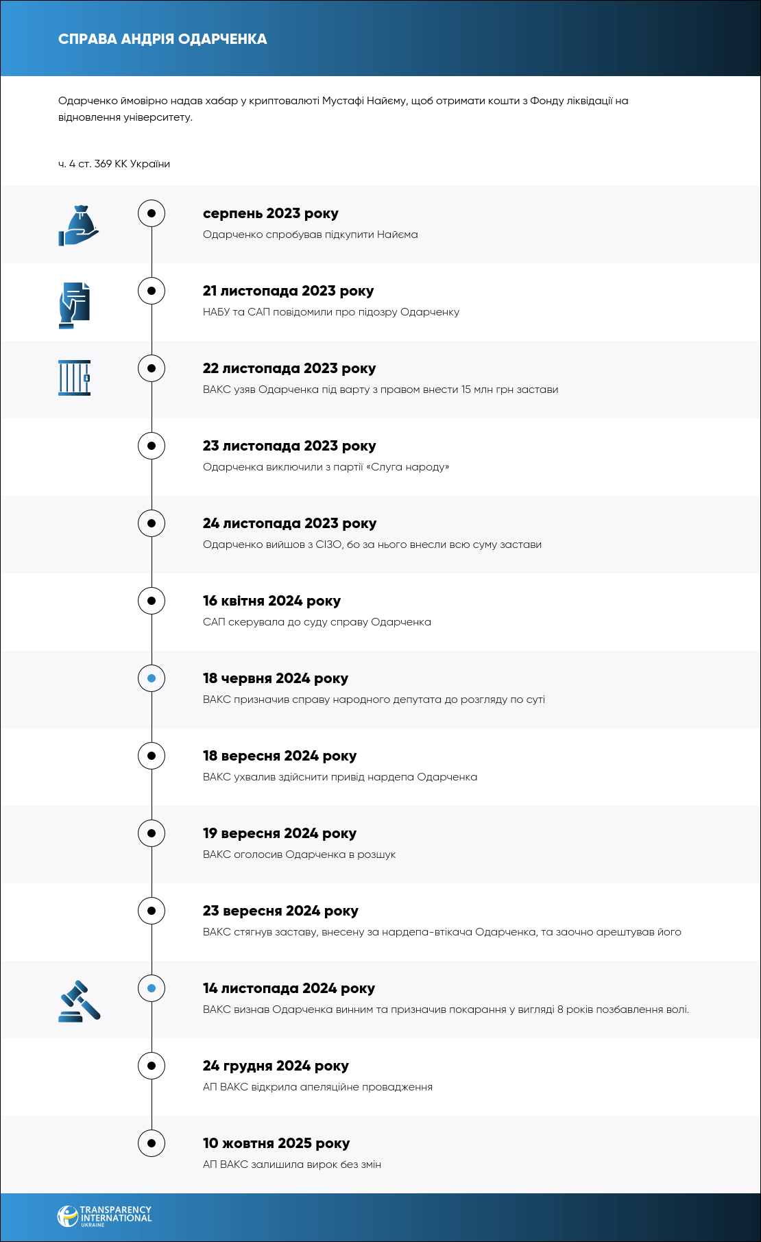 14 листопада 2024 року ВАКС визнав народного депутата Андрія Одарченка винним у спробі підкупити за біткоїни ексголову Держагентства з відновлення Мустафу Найєма. Суддя Віктор Ногачевський призначив нардепу 8 років позбавлення волі. Вирок оскаржується в АП ВАКС.