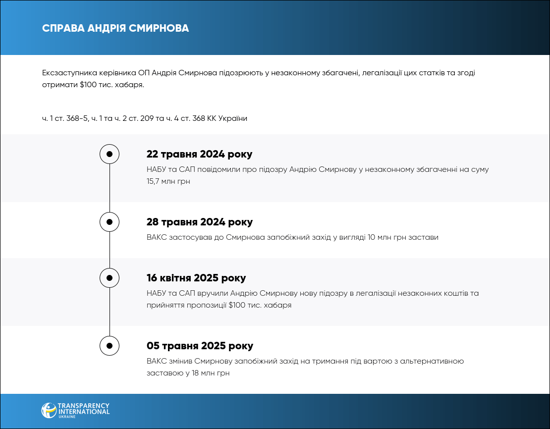 НАБУ розслідує справу про підбурення підприємця до надання хабаря у сумі $250 тис. за нібито застосування санкцій РНБО до компанії-конкурентки. У справі фігурують народна депутатка Анна Скороход, її помічник Сергій Капацин, та їх спільник — Ставенко.