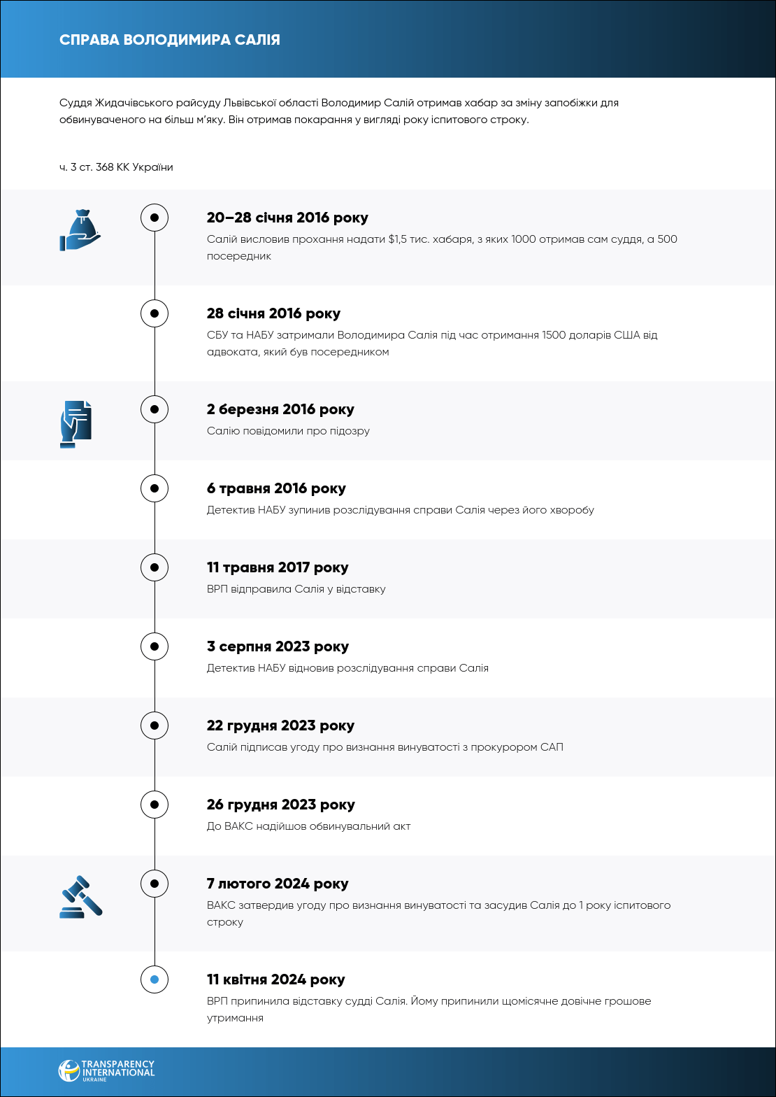 7 лютого 2024 року ВАКС визнав винним суддю у відставці Володимира Салія в отриманні $1 тис. хабаря. Йому призначили рік іспитового строку за угодою з прокурором.