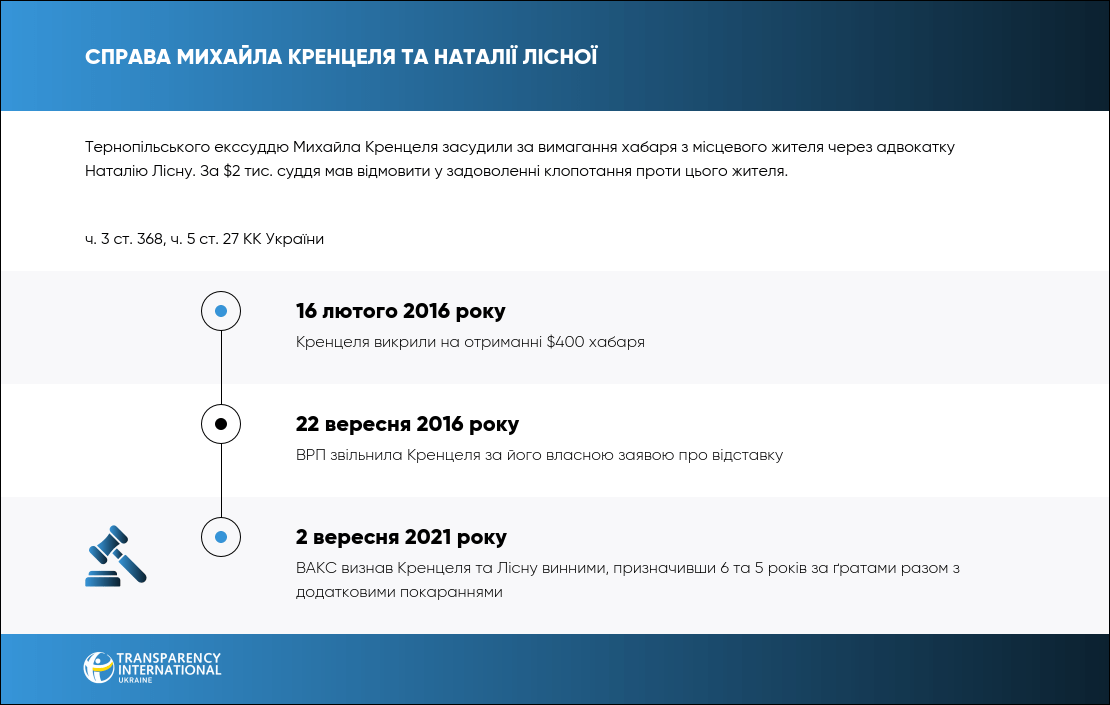 2 вересня 2021 року ВАКС визнав винними тернопільського суддю Михайла Кренцеля та адвокатку Наталію Лісну у вимаганні хабаря за «вирішення» питання місцевого жителя в суді.