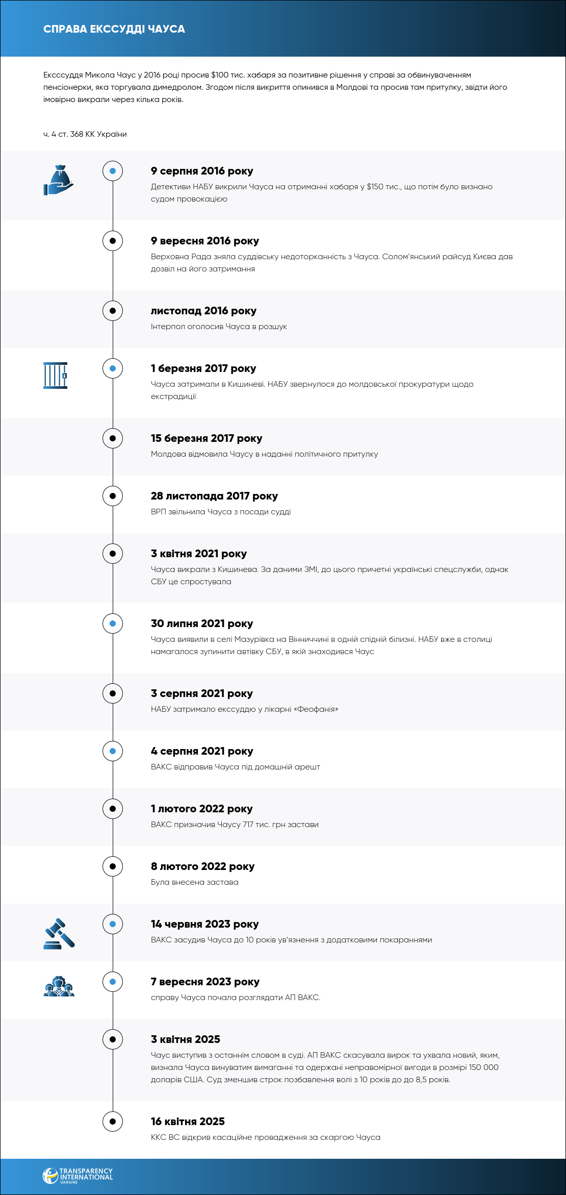 14 червня 2023 року ВАКС визнав винним екссуддю Дніпровського райсуду Києва Миколу Чауса. Він просив $100 тис. за умовне покарання для обвинуваченої в торгівлі димедролом. Йому призначили 10 років позбавлення волі з додатковими покараннями.