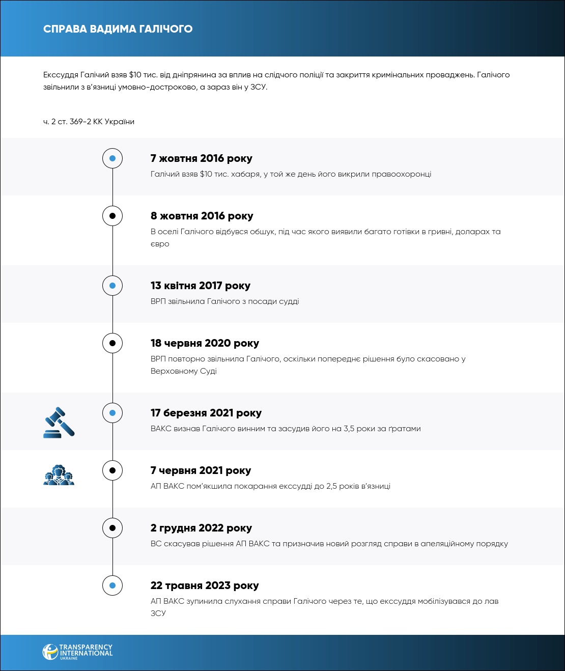 17 березня 2021 року ВАКС визнав винним колишнього дніпровського суддю Вадима Галічого у зловживанні впливом. Той обіцяв місцевому жителю за хабар вплинути на слідчих поліції Дніпра. Галічий отримав 3,5 роки в’язниці.