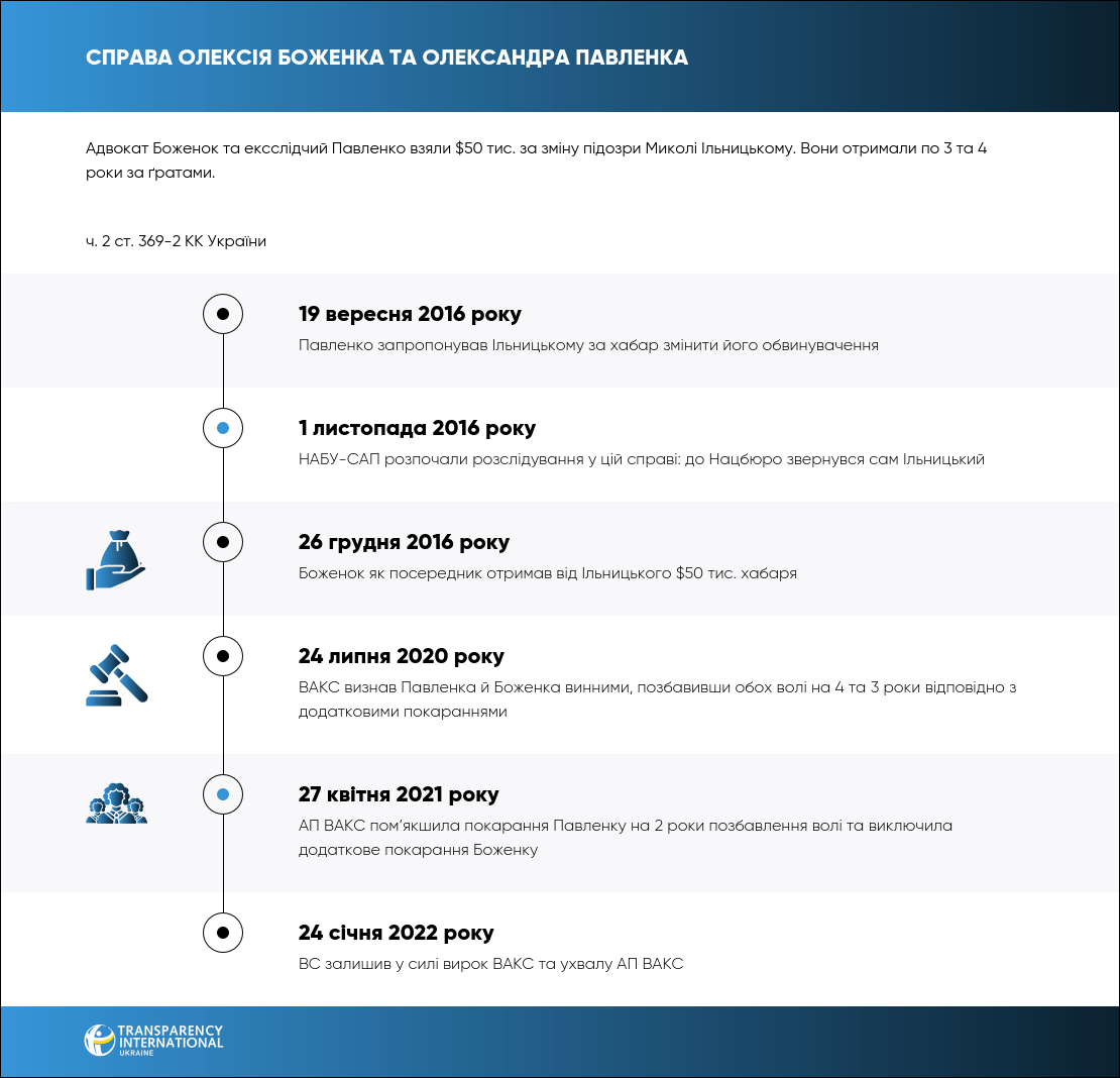 24 липня 2020 року ВАКС визнав винними адвоката Олексія Боженка та ексслідчого прокуратури Київської області Олександра Павленка в одержанні $50 тис. за вплив на рішення прокурора для перекваліфікацію підозри Миколі Ільницькому. Обидвох засудили на 3 та 4 роки в’язниці відповідно.