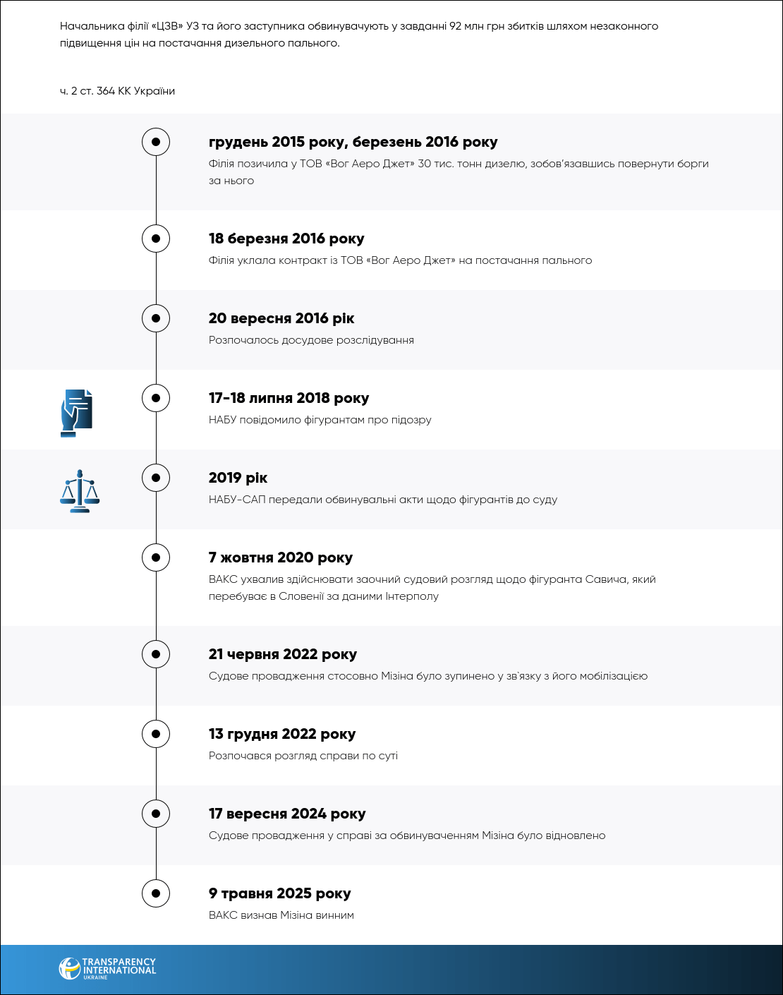 Екскерівник Філії «ЦЗВ» ПАТ «Укрзалізниця» Дмитро Мізін визнав себе винним. ВАКС затвердив угоду про визнання винуватості та визнав його винним в кримінальному правопорушенні передбаченому ч. 2 ст. 364 КК України. Йому призначено 5 років позбавлення волі з позбавленням права обіймати певні посади строком на 3 роки та із штрафом у розмірі 17 тис. грн. На підставі угоди ВАКС ухвалив звільнити обвинуваченого від відбування основного покарання з іспитовим строком 2 роки. У 2022 році Мізін мобілізувався та продовжує проходити службу.