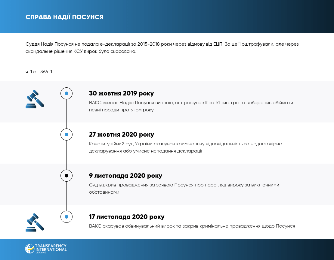 30 жовтня 2019 року ВАКС визнав винною суддю Апеляційного суду Дніпропетровської області Надію Посунся у неподанні електронної декларації за 2015-2018 роки. Вона отримала штраф 51 тис. грн, але пізніше цей вирок було скасовано через скандальне рішення Конституційного суду України. Воно скасувало кримінальну відповідальність за недостовірне декларування або умисне неподання декларації.