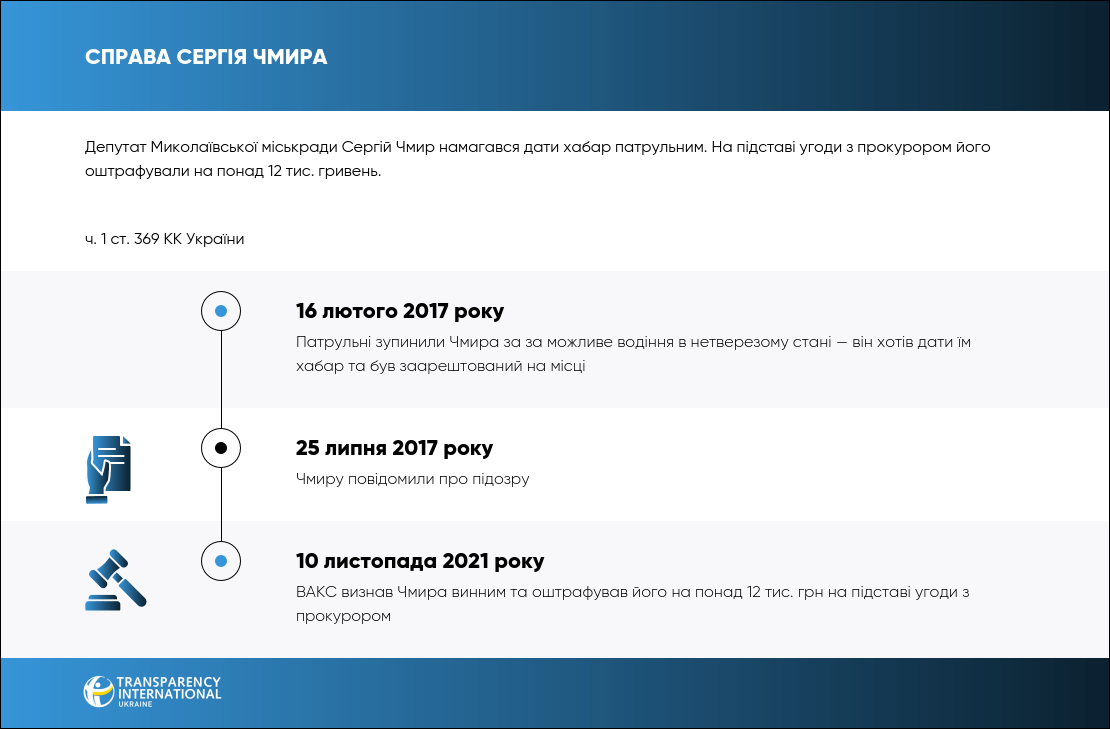 Сергій Чмир був депутатом Миколаївської міськради 7-го скликання. У лютому 2017-го патрульні зупинили його, щоб перевірити на можливе керування автівкою в нетверезому стані. Чмир проігнорував вимогу надати документи та намагався запропонувати поліцейським тисячу гривень хабаря, щоб ті не складали протокол. Патрульні заарештували депутата на місці злочину.
