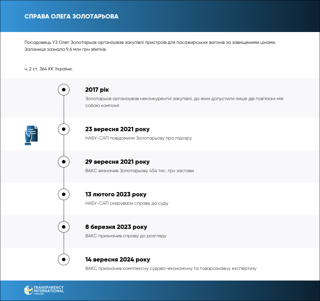 Як стверджує сторона обвинувачення, у 2017 році УЗ оголосила торги, на яких планували закупити пристрої живлення для пасажирських вагонів. Начальник регіональної філії «Південно-Західна залізниця» Олег Золотарьов, нібито встановив вимогу до всіх потенційних учасників у тендері, за якою УЗ мала погодити креслення продукції постачальників, і таким чином спотворив умови конкуренції